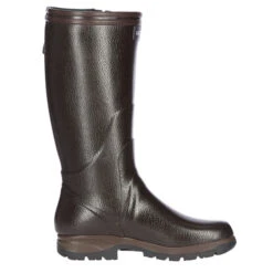Auffallend ist der weit hoch geschnittene Schaft des hochwertigen Gummistifels, der sich mit einer Schnalle auf der Innenseite in der Weite regulieren lässt. Der Stiefel besteht beinahe vollständig aus Naturkautschuk, ist also absolut wasserdicht. Der Stiefel verfügt außerdem über ein weiches und feuchtigkeitsleitendes Polyesterfutter.