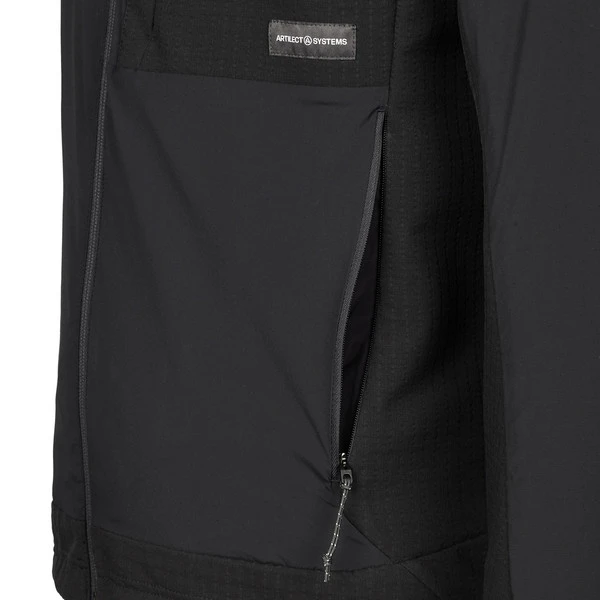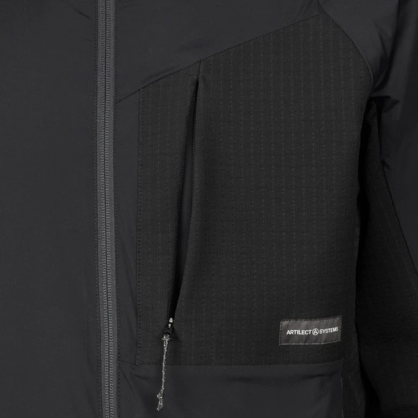 Die Kapuze optimiert den Komfort bei Wind und Wetter und sitzt durch Volumenregulierung und teilelastische Einfassung bequem am Kopf. Auch der Saum ist in der Weite verstellbar für einen passgenauen Sitz, während die Ärmelbündchen ebenfalls teilelastisch sind. Ganz besonders ist der Front-RV, der auf den ersten Blick gewöhnlich wirkt. Doch der YKK Touchlink Zipper mit LifeKey lässt sich per NFC mit dem Smartphone verbinden, um Informationen zur Darkstart bereitzustellen und Ressourcen in Form von Hangtags zu sparen.
