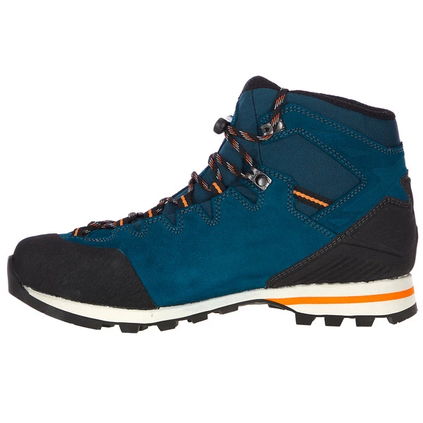 Als Obermaterial kommt hauptsächlich hochwertiges Perwanger Velours-Spaltleder zum Einsatz. Durch das robuste Leder sind nicht nur Felskontakte kein Problem, es verleiht dem Stiefel außerdem einen fetzigen Look. Im Bereich der Ferse und der Zehen wurde zusätzlich auf robuste Schutzkappen aus TPU zurückgegriffen. Im Bereich der Schuhzunge, der Knöchel sowie des Schaftabschlusses kommt geschmeidigeres Symthetik-Mesh zum Einsatz. Dadurch kannst du dich mit dem Makra noch freier bewegen.