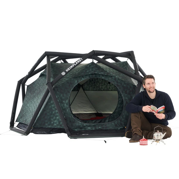 Extrem schneller Aufbau in nur einem einzigen Arbeitsschritt: ausrollen – aufpumpen – fertig. Die geodätische Bauweise des Zeltes sorgt für gute Stabilität bei Wind und Wetter.