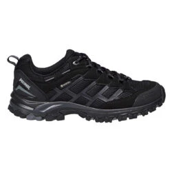Der Halbschuh ist aus leichten Synthetikmaterialien gefertigt, die partiell mit Veloursleder verstärkt werden. Fersenbereich und Schuhspitze sind zusätzlich mit stabilen Kappen aus Gummi, bzw. Kunststoff geschützt. Regenwetter macht dem Schuh auch nichts aus, denn eine Gore-Tex Membran macht ihn zuverlässig wasserdicht und obendrein atmungsaktiv. Auch wird durch die Membran ein vernünftiger Feuchtigkeitsaustausch gewährleistet und das Fußklima angenehm reguliert.