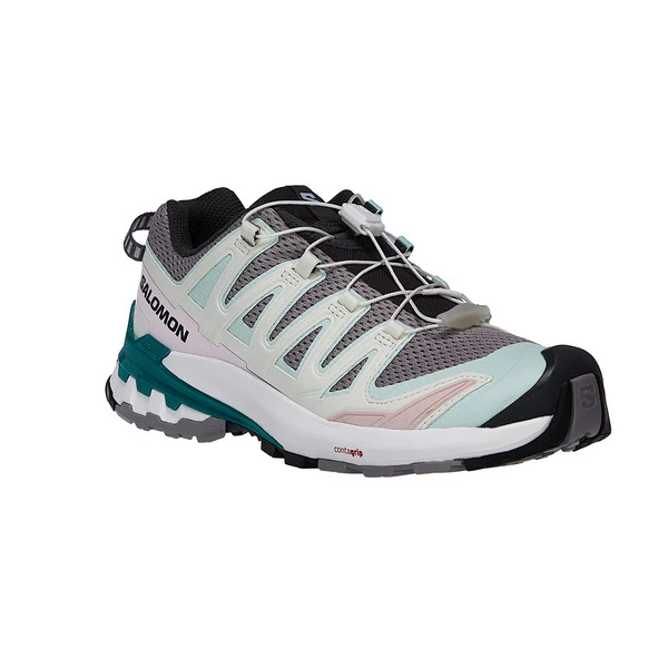 Das ist der XA Pro 3D V9 von Salomon. Aus schnell trocknendem, luftigem Mesh und stabilisierendem TPU-Verstärkungen. Innen leicht gepolstert und mit synthetischem Futter ausgestattet. Für angenehmes Auftreten und gut klimatisierte Füße. Die verdeckt eingearbeitete Zunge verhindert das Eindringen störender Kleinstteilchen.