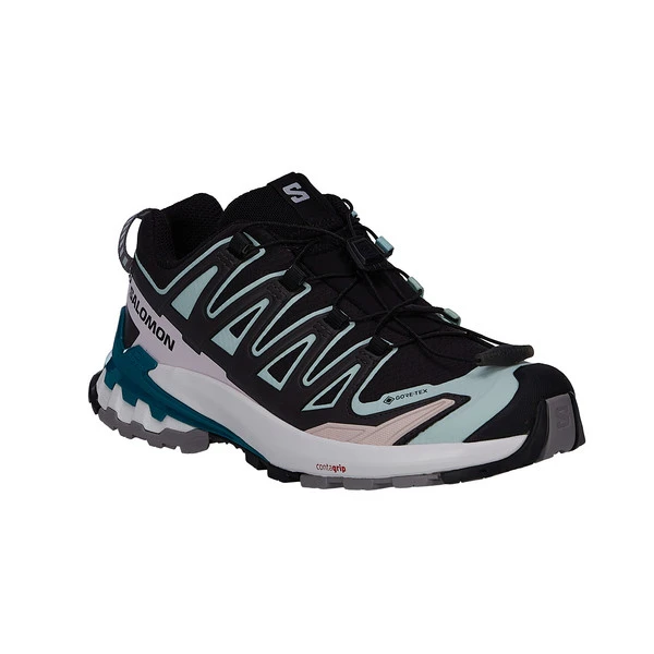Das ist der XA Pro 3D V9 von Salomon. Aus schnell trocknendem, luftigem Mesh und stabilisierendem TPU-Verstärkungen. Innen leicht gepolstert und mit synthetischem Futter ausgestattet. Für angenehmes Auftreten und gut klimatisierte Füße. Die verdeckt eingearbeitete Zunge verhindert das Eindringen störender Kleinstteilchen. Übrigens werden deine Füße in dieser Version auch vor eindringendem Wasser geschützt. Eine zum Einsatz kommende Gore-Tex Membran bietet Schutz bei Regen und Feuchtigkeit und sorgt dank hochgradiger Atmungsaktivität auch für ein ausgeglichenes Trageklima.