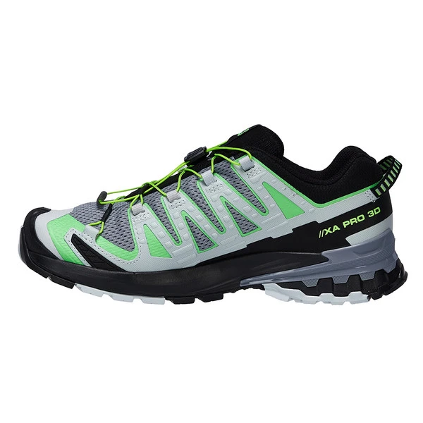 Das ist der XA Pro 3D V9 von Salomon. Aus schnell trocknendem, luftigem Mesh und stabilisierendem TPU-Verstärkungen. Innen leicht gepolstert und mit synthetischem Futter ausgestattet. Für angenehmes Auftreten und gut klimatisierte Füße. Die verdeckt eingearbeitete Zunge verhindert das Eindringen störender Kleinstteilchen.