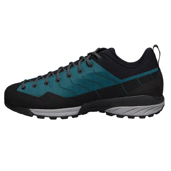 Der robuste Zustiegsschuh verdankt sein geringes Gewicht hauptsächlich dem luftigen Obermaterial. Hier kommt ausschließlich synthetisches Gestrick zum Einsatz, das einen Recyclinganteil von 45% besitzt. Dadurch ist der Zustiegsschuh aber nicht nur schön leicht, er ist außerdem extrem atmungsaktiv. Eignet sich also gerade für sehr kräftezehrende, technische Anstiege, gerade bei besonders warmen Temperaturen und sonnigem Wetter! Er wird ringsherum durch einen robusten Geröllschutzrand sowie eine zusätzliche Gummierung am Vorfuß vor Beschädigung geschützt. Die wie bei einem Kletterschuh weit nach vorne gezogene Schnürung sorgt für ausgezeichnete Anpassung und Präzisen Tritt bis in die Spitze.