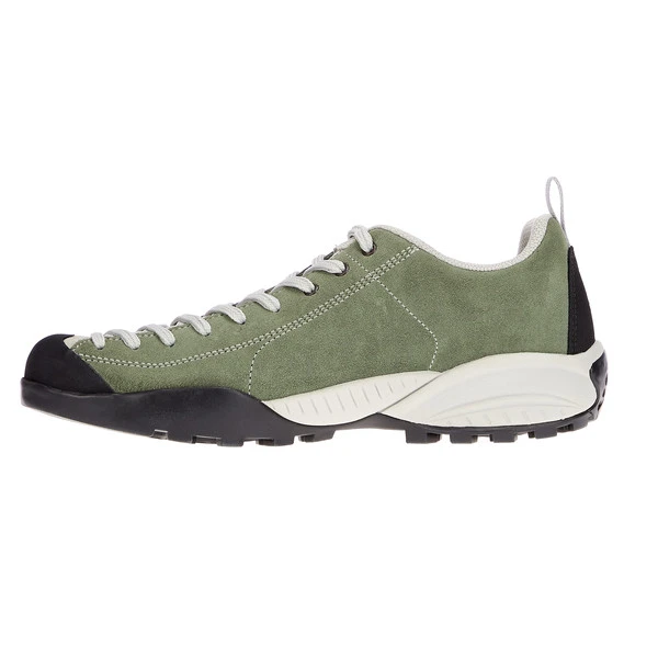 Die profillose Spitze der Laufsohle erweitert das Einsatzgebiet dieser Freizeitschuhe und ermöglicht kleine Ausflüge an den Fels. Außen zeigt sich weiches Veloursleder, Fersen- und Zehenbereiche sind mit Gummibesätzen verstärkt. Innen kommt luftiges Mesh und feuchtigkeitsleitendes Textilgewebe zum Einsatz. Die EVA-Zwischensohle und ein EVA-Shock-Absorber im Fersenbereich sorgen für angenehmen Laufkomfort; die Gummilaufsohle von Vibram gibt Halt.